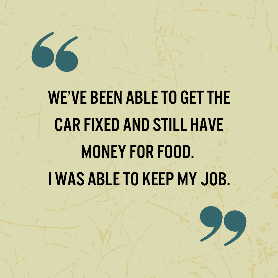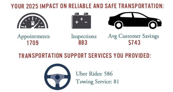 But it’s more than that: individuals who have cars are more likely to report a higher quality of life, obtain and maintain jobs, and report an increase in feeling independent. Our focus on providing honest advice and reliable car repairs is driven by the belief that we’re all safer on the roads because of our work. Thank you for your partnership and for being part of our community.